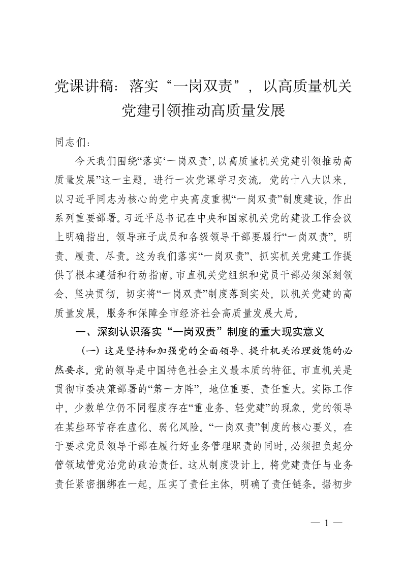 党课讲稿:落实“一岗双责”,以高质量机关党建引领推动高质量发展