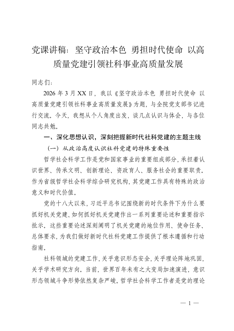 党课讲稿:坚守政治本色 勇担时代使命 以高质量党建引领社科事业高质量发展