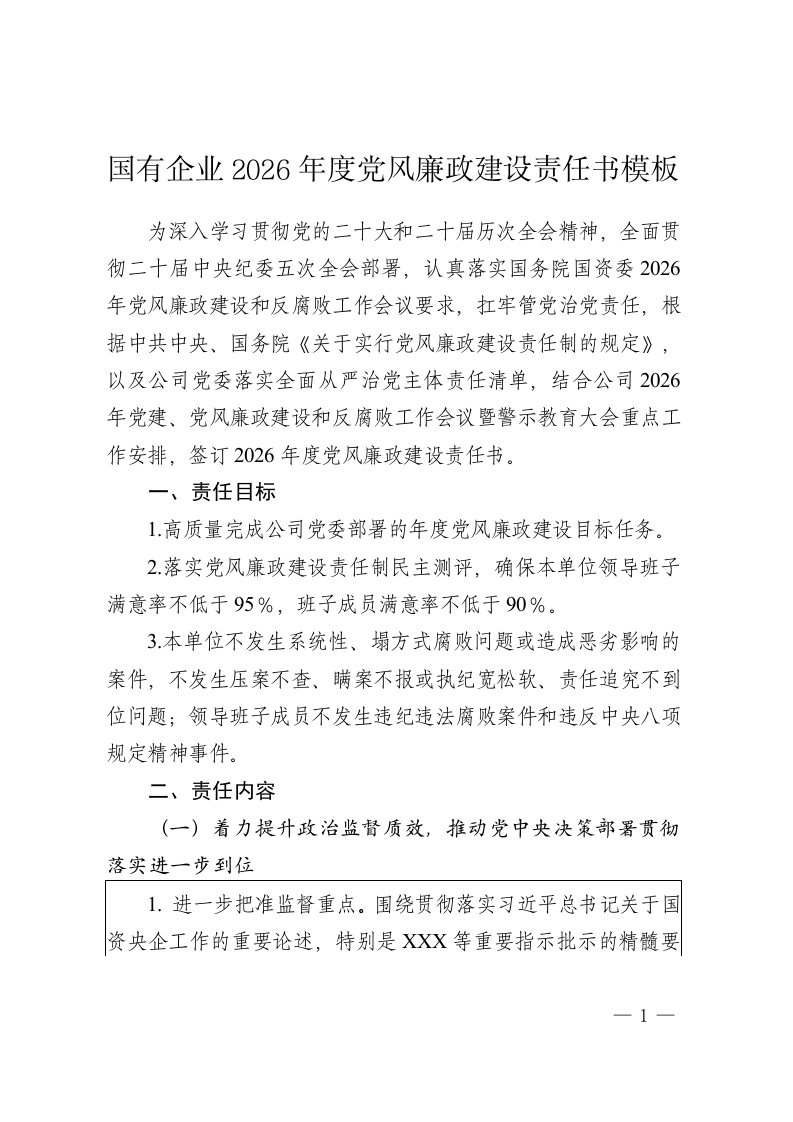 首页公文大全工作汇报国有企业2026年度党风廉政建设责任书模板