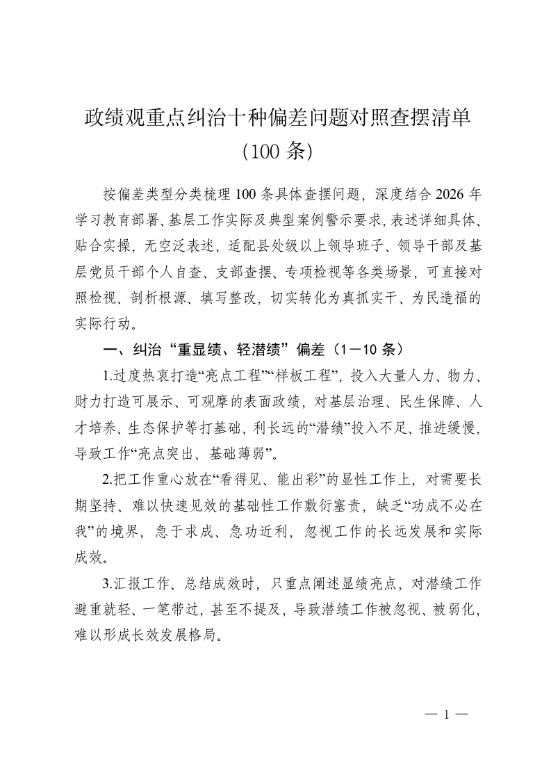 政绩观重点纠治十种偏差问题对照查摆清单(100条)