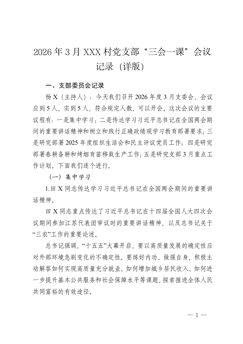 2026年3月XXX村党支部“三会一课”会议记录(详版)