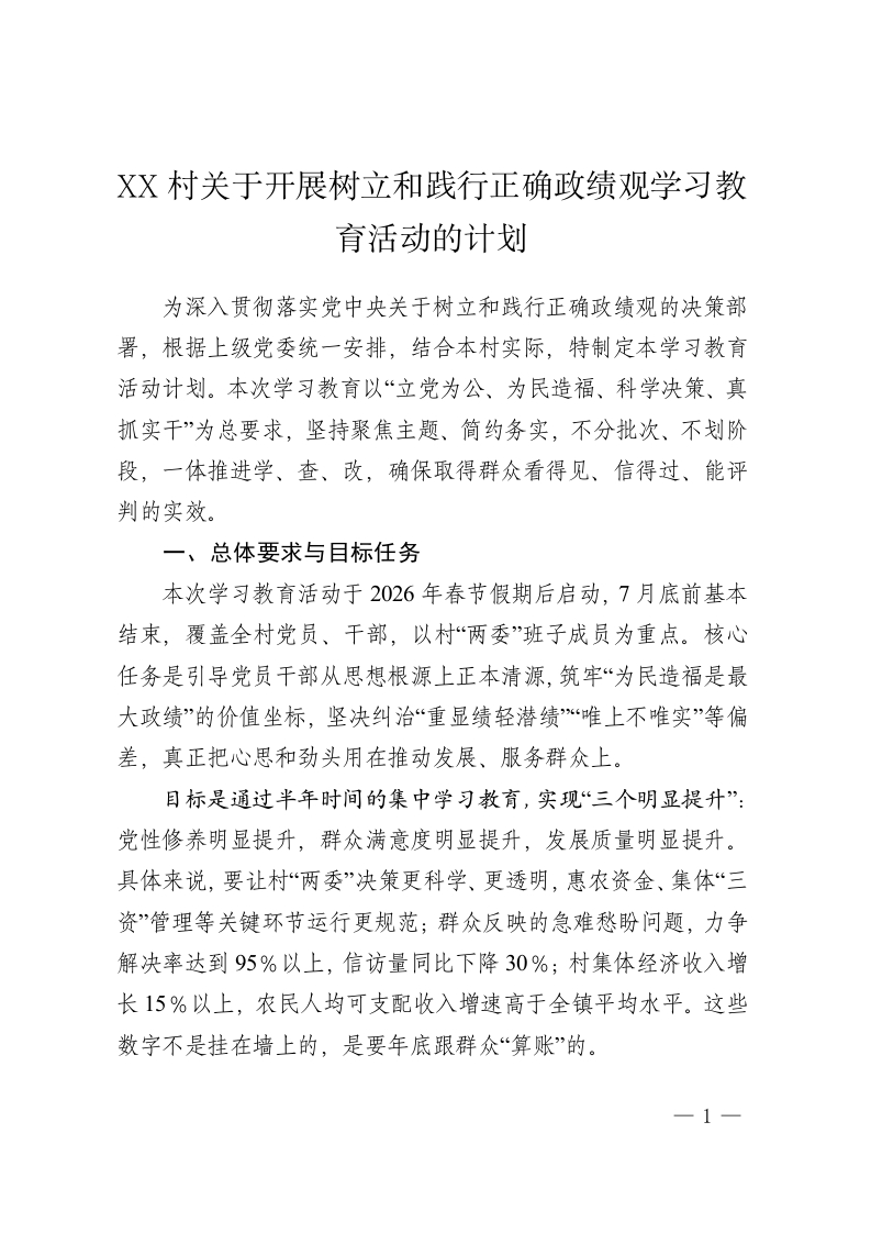 XX村关于开展树立和践行正确政绩观学习教育活动的计划
