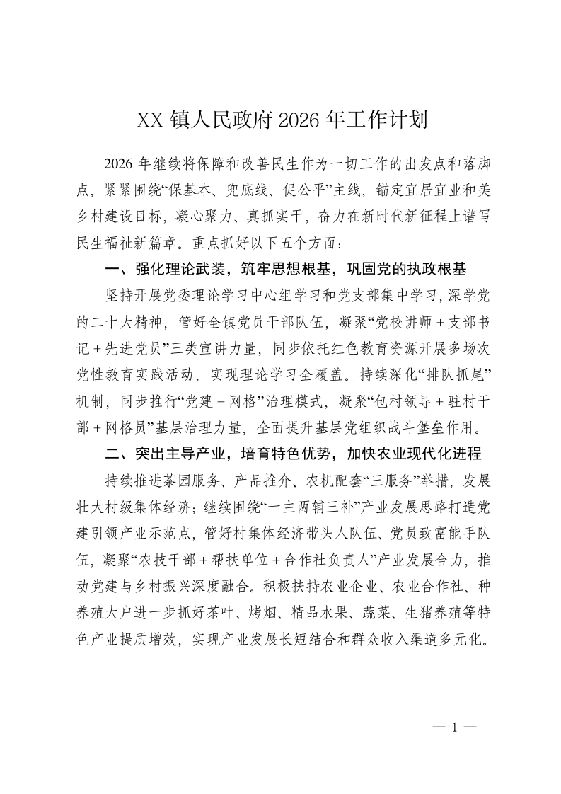 XX镇人民政府2026年工作计划