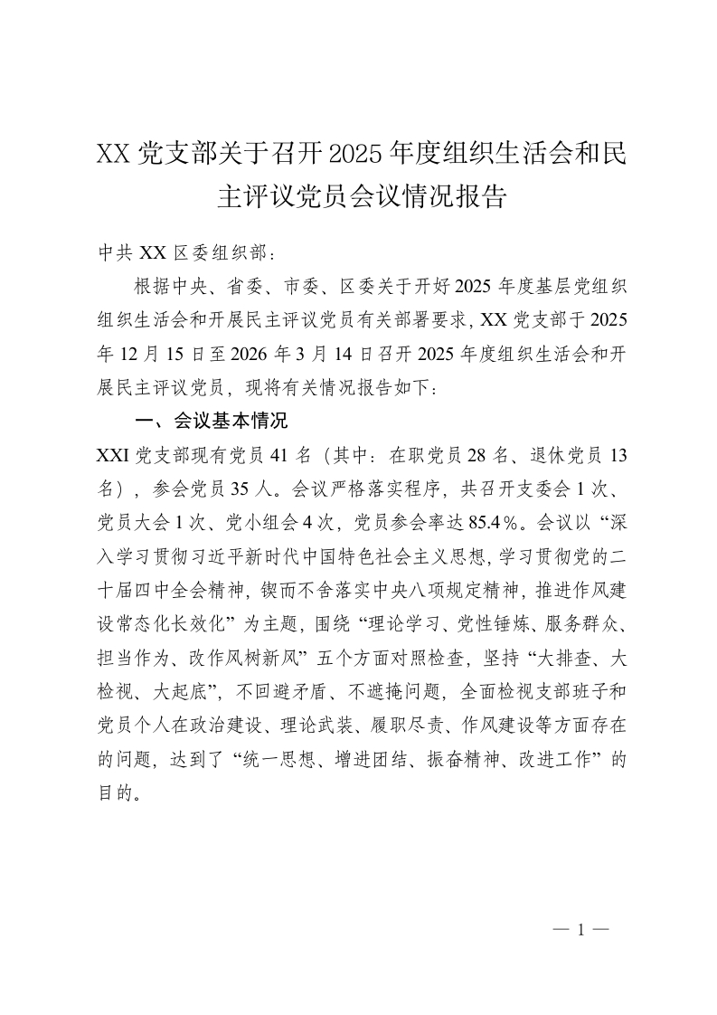 XX党支部关于召开2025年度组织生活会和民主评议党员会议情况报告