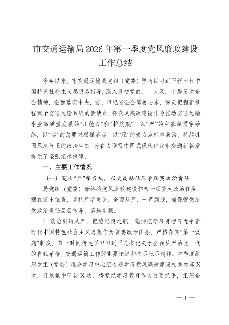 市交通运输局2026年第一季度党风廉政建设工作总结
