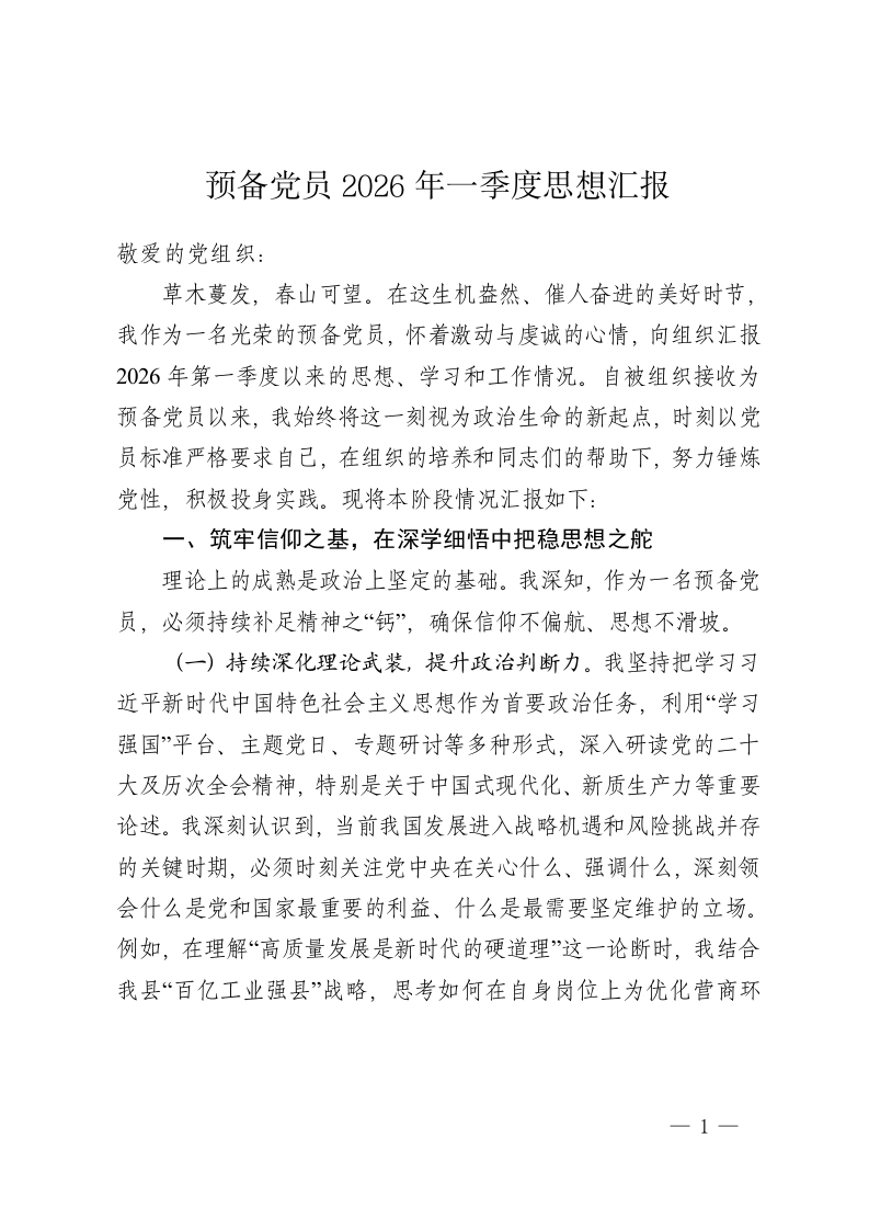 预备党员2026年一季度思想汇报