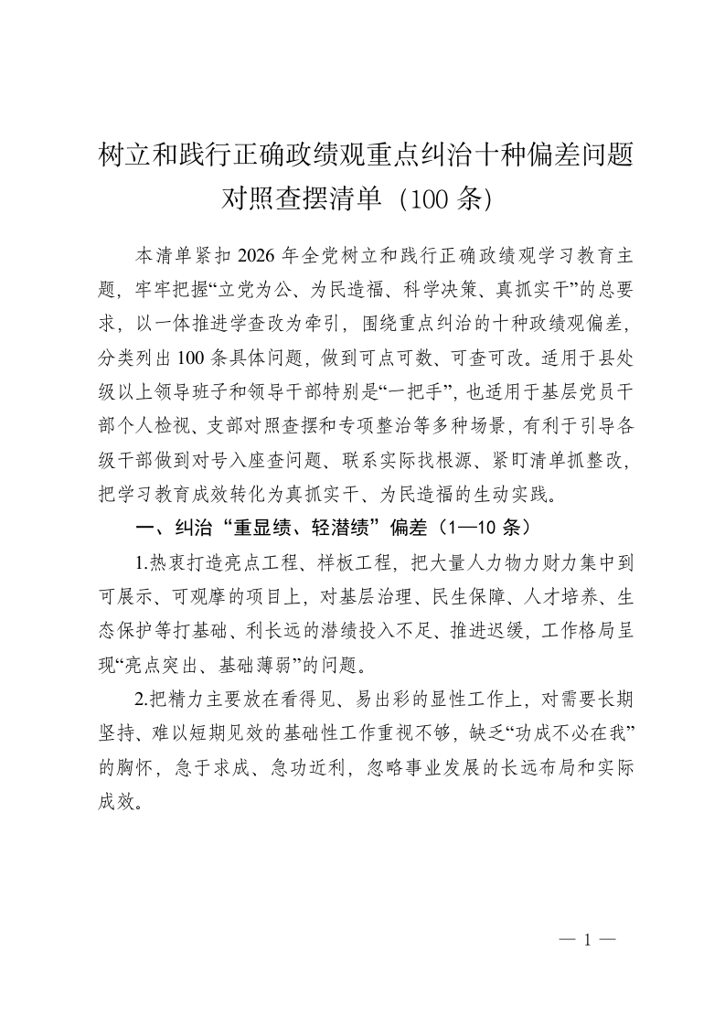 树立和践行正确政绩观重点纠治十种偏差问题对照查摆清单(100条)