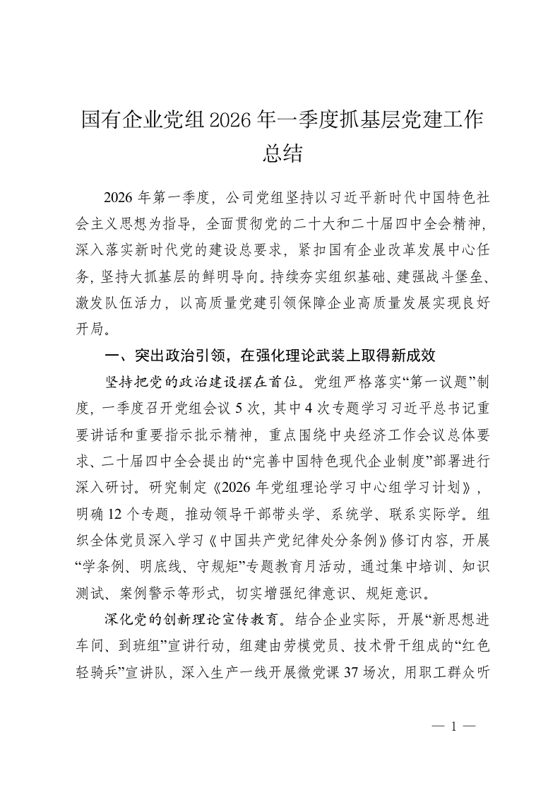 国有企业党组2026年一季度抓基层党建工作总结
