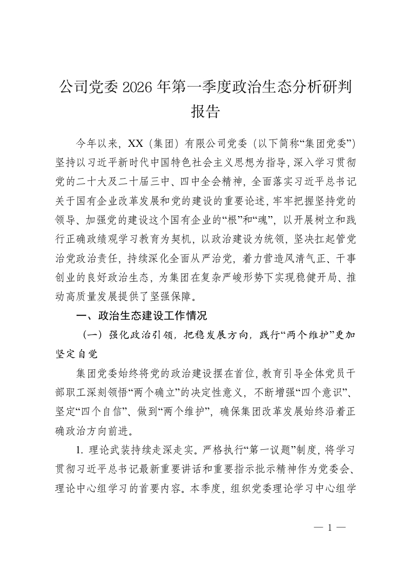 公司党委2026年第一季度政治生态分析研判报告