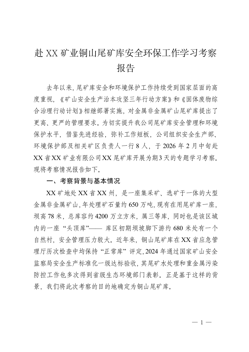 赴 XX矿业铜山尾矿库安全环保工作学习考察报告