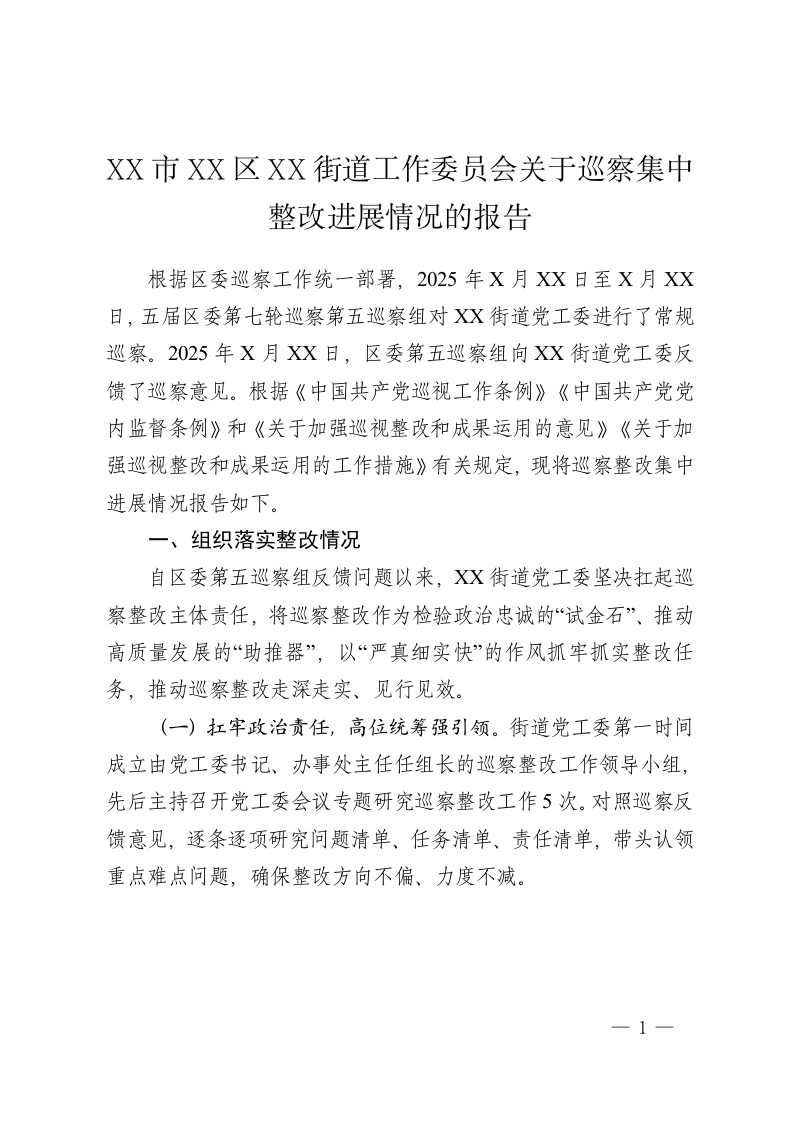 首页公文大全总结报告XX市XX区XX街道工作委员会关于巡察集中整改进展情况的报告