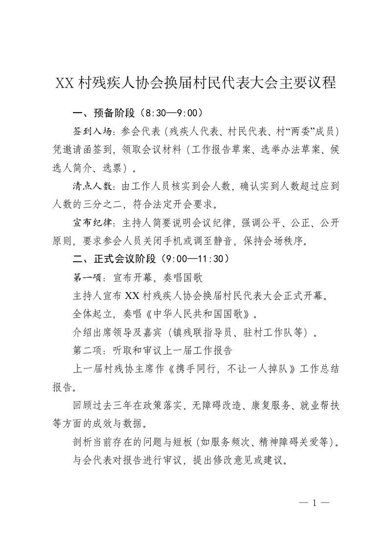 XX村残疾人协会换届村民代表大会主要议程