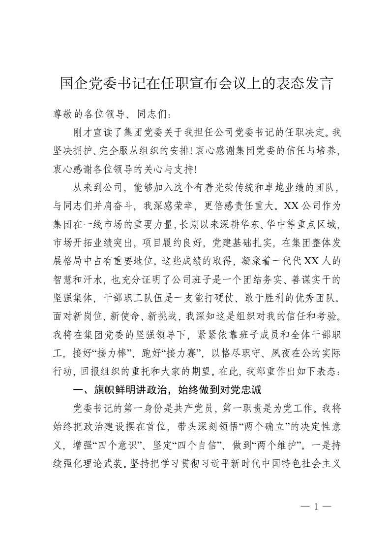 国企党委书记在任职宣布会议上的表态发言