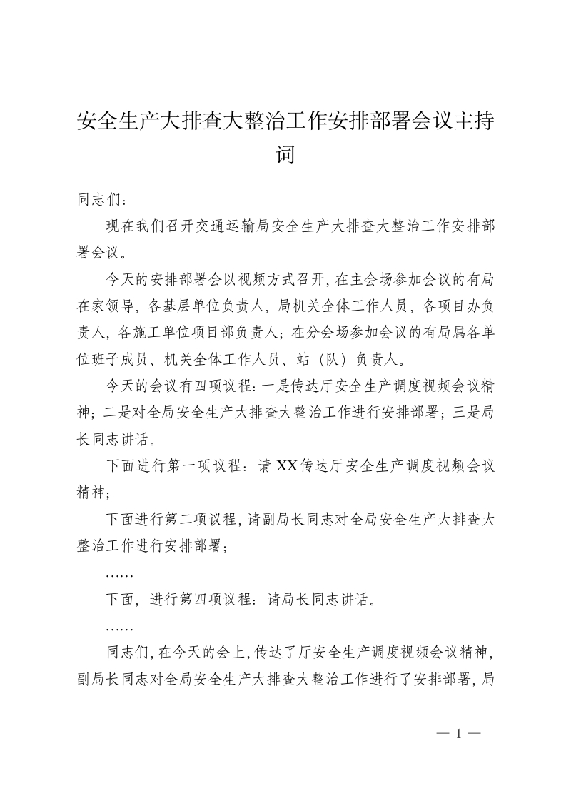 安全生产大排查大整治工作安排部署会议主持词