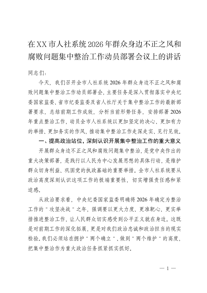 在XX市人社系统2026年群众身边不正之风和腐败问题集中整治工作动员部署会议上的讲话