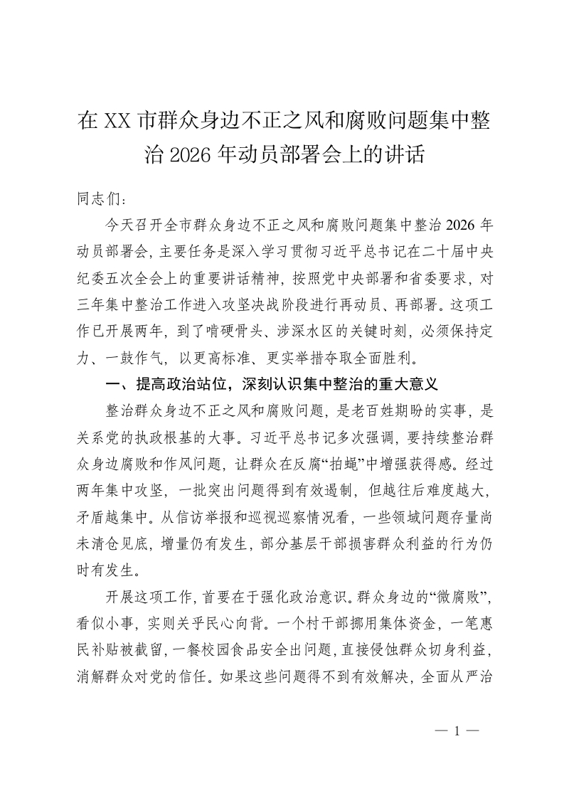 首页公文大全讲话发言在XX市群众身边不正之风和腐败问题集中整治2026年动员部署会上的讲话2