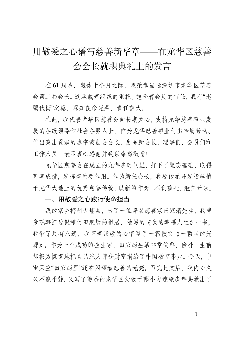 用敬爱之心谱写慈善新华章——在龙华区慈善会会长就职典礼上的发言