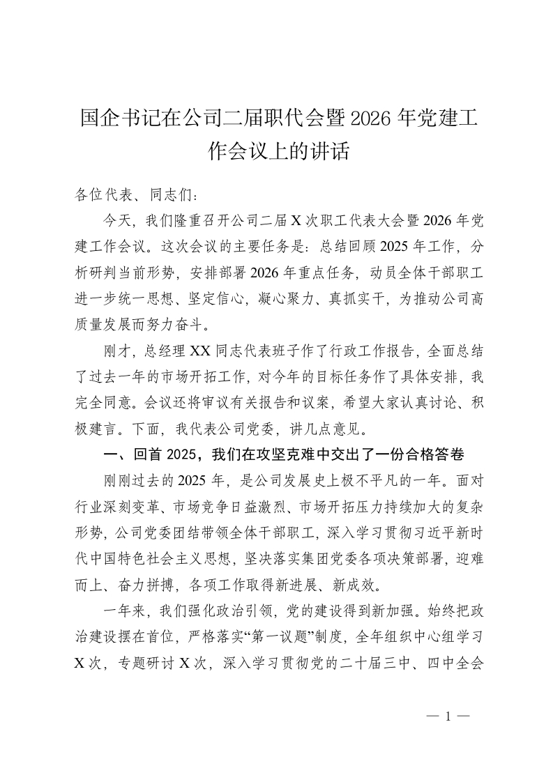 国企书记在公司二届职代会暨2026年党建工作会议上的讲话