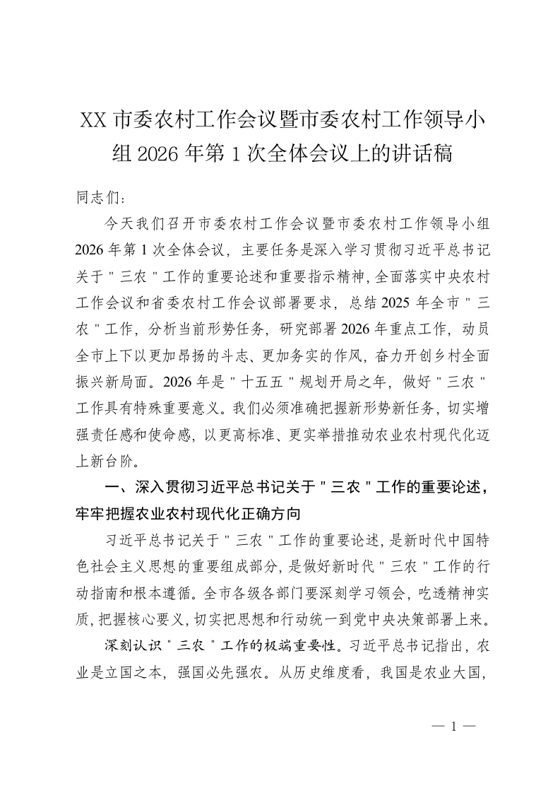 XX市委农村工作会议暨市委农村工作领导小组2026年第1次全体会议上的讲话稿