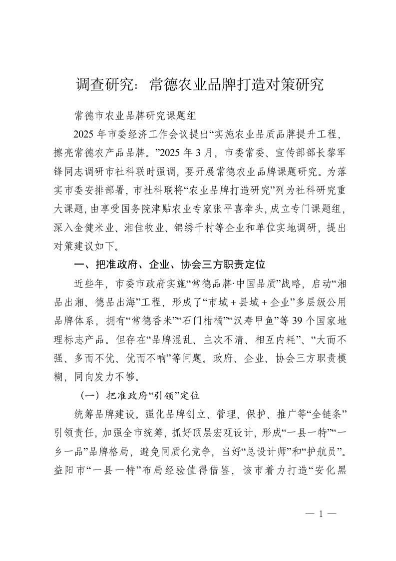 调查研究:常德农业品牌打造对策研究