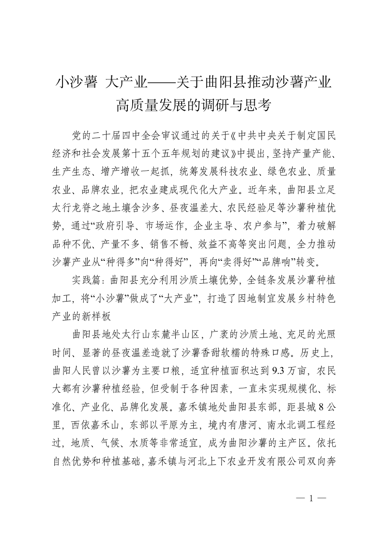 小沙薯 大产业——关于曲阳县推动沙薯产业高质量发展的调研与思考