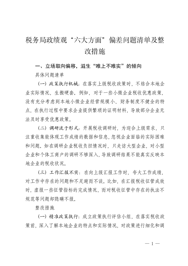 税务局政绩观“六大方面”偏差问题清单及整改措施