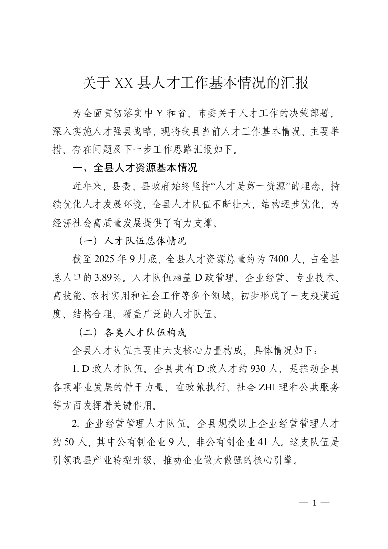 关于XX县人才工作基本情况的汇报