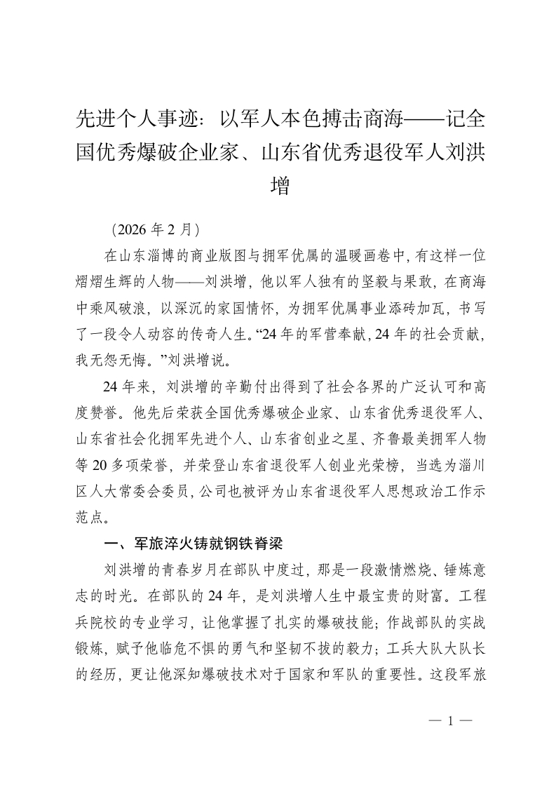 先进个人事迹:以军人本色搏击商海——记全国优秀爆破企业家、山东省优秀退役军人刘洪增