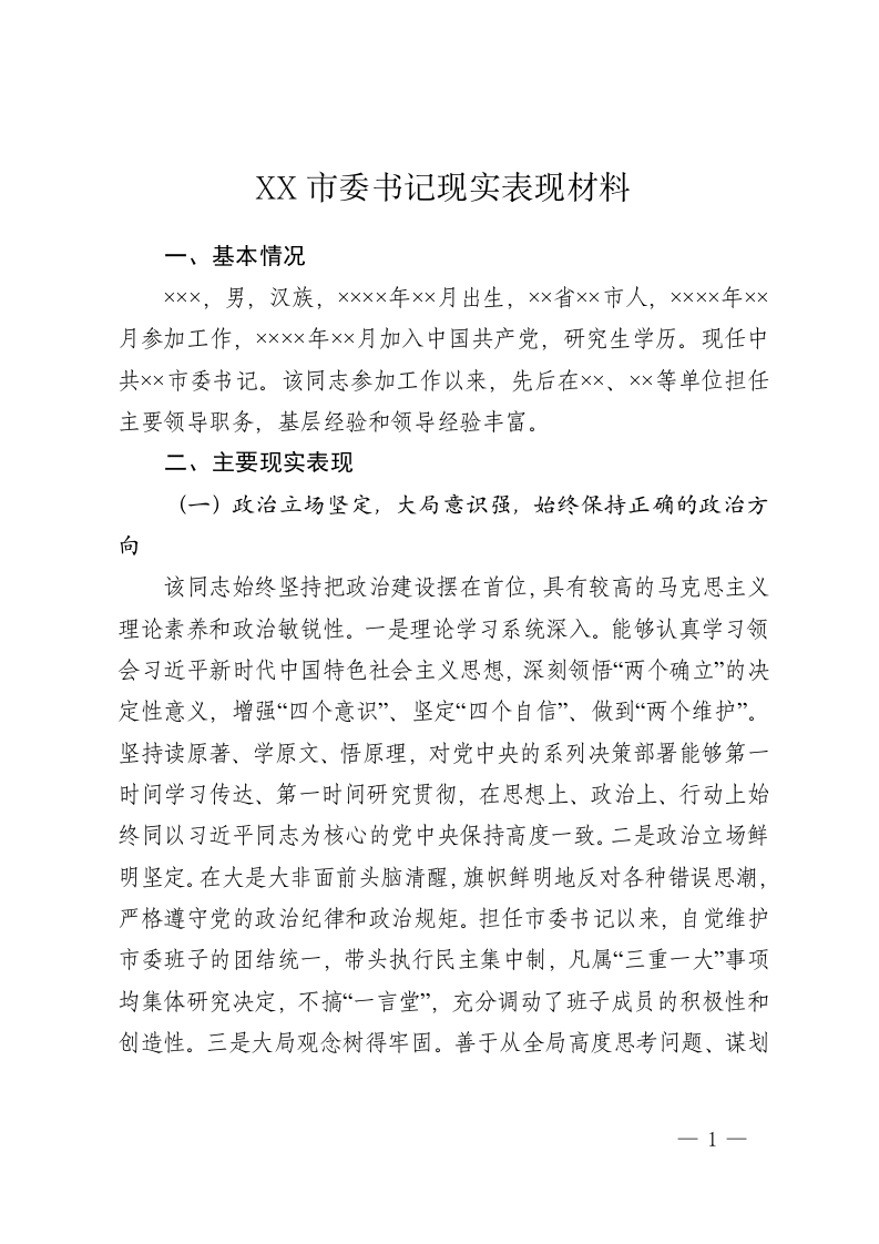 XX市委书记现实表现材料