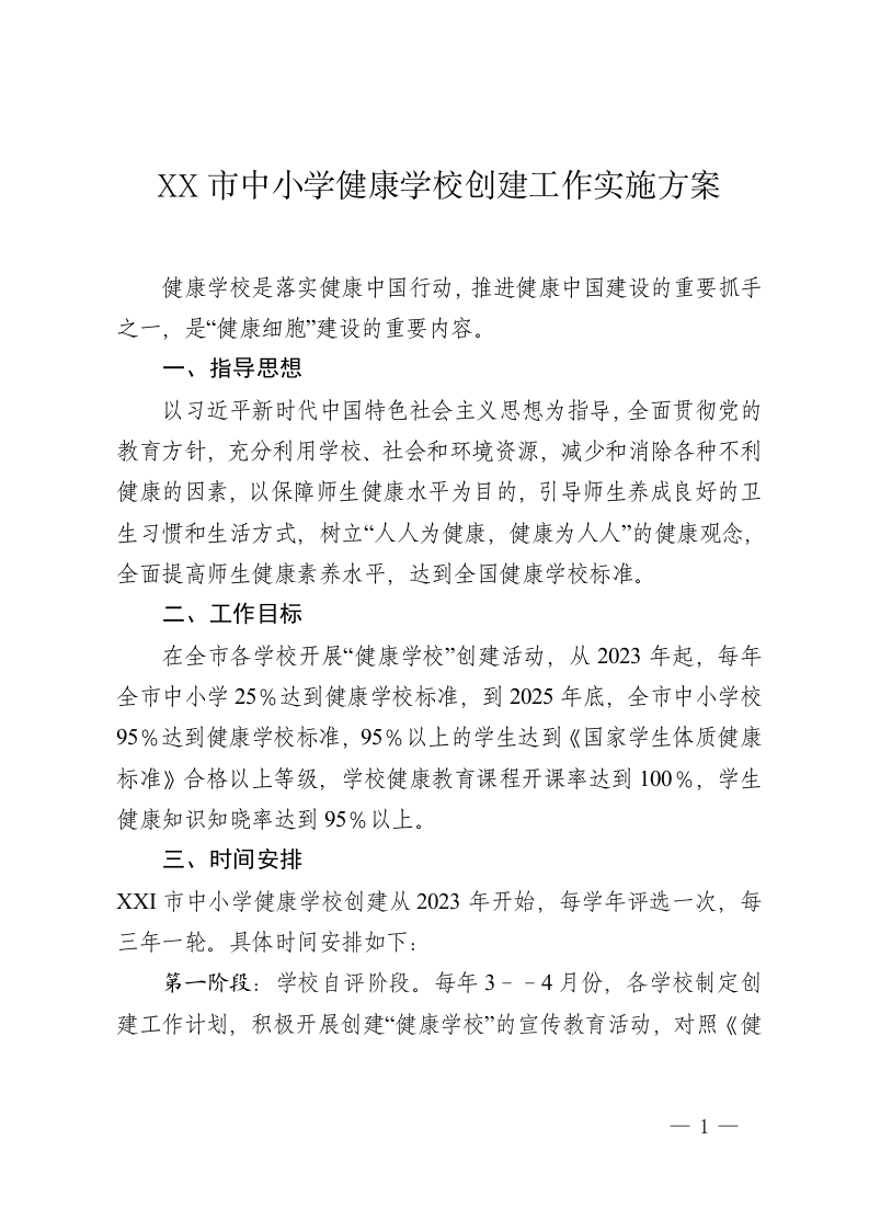 XX市中小学健康学校创建工作实施方案