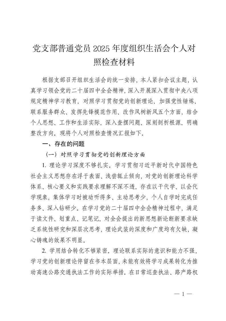 首页公文大全组织生活会党支部普通党员2025年度组织生活会个人对照检查材料