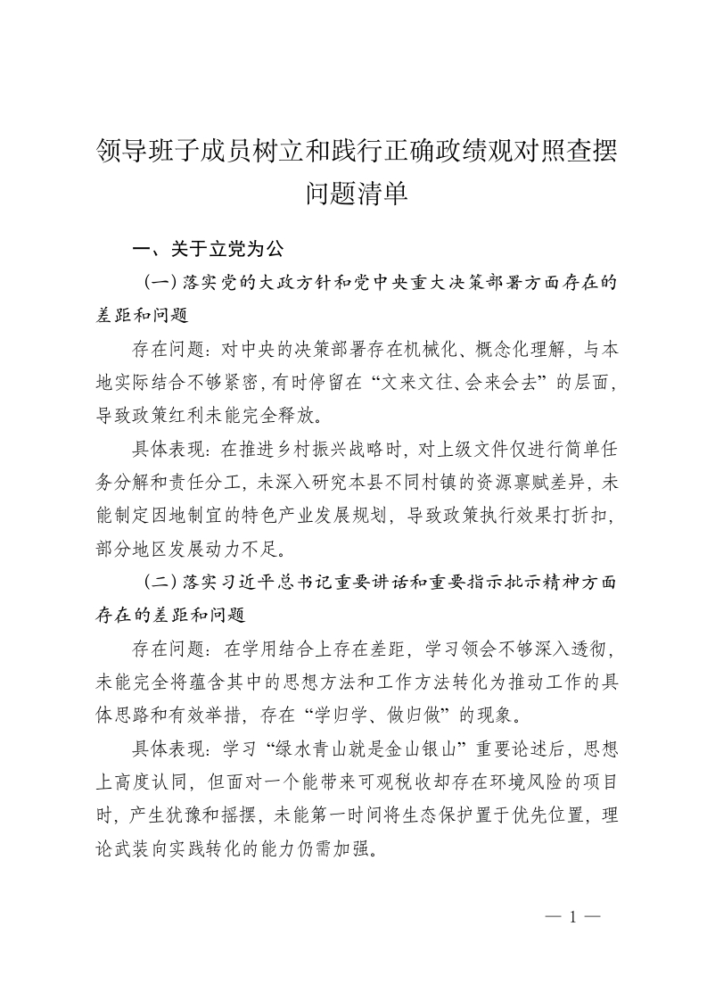 领导班子成员树立和践行正确政绩观对照查摆问题清单