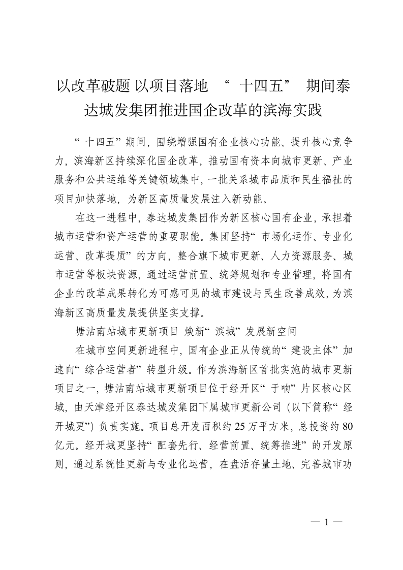 以改革破题 以项目落地 “ 十四五” 期间泰达城发集团推进国企改革的滨海实践