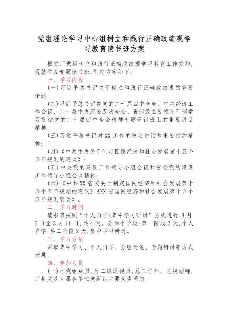 党组理论学习中心组树立和践行正确政绩观学习教育读书班方案