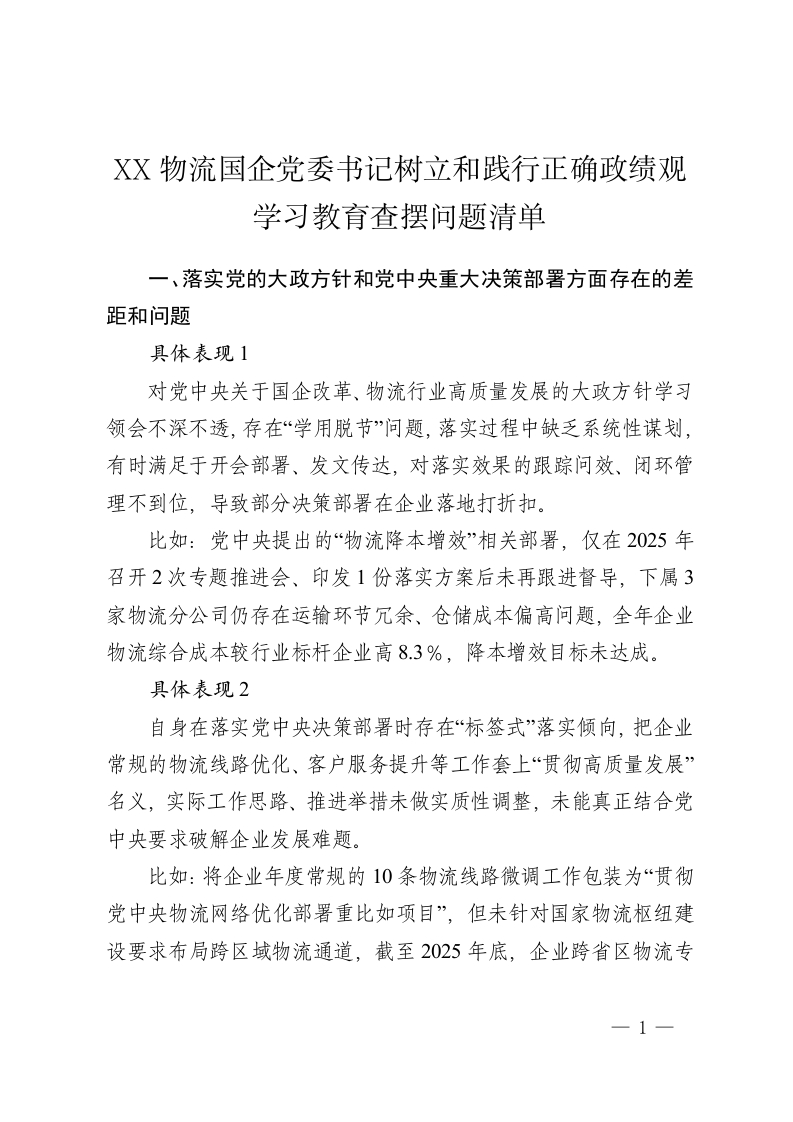 XX物流国企党委书记树立和践行正确政绩观学习教育查摆问题清单2
