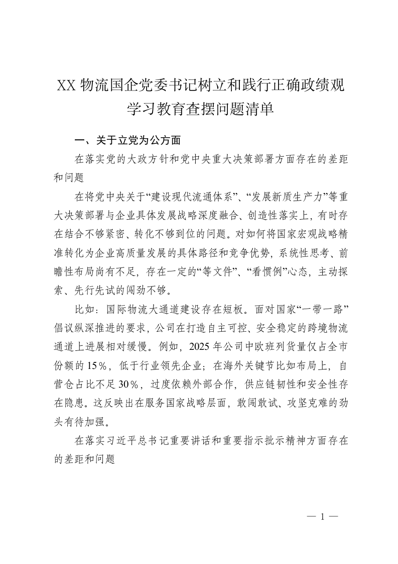 XX物流国企党委书记树立和践行正确政绩观学习教育查摆问题清单
