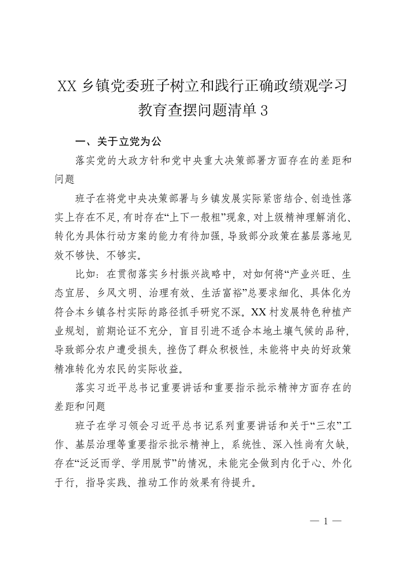 XX乡镇党委班子树立和践行正确政绩观学习教育查摆问题清单3
