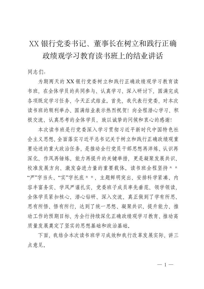 XX银行党委书记、董事长在树立和践行正确政绩观学习教育读书班上的结业讲话