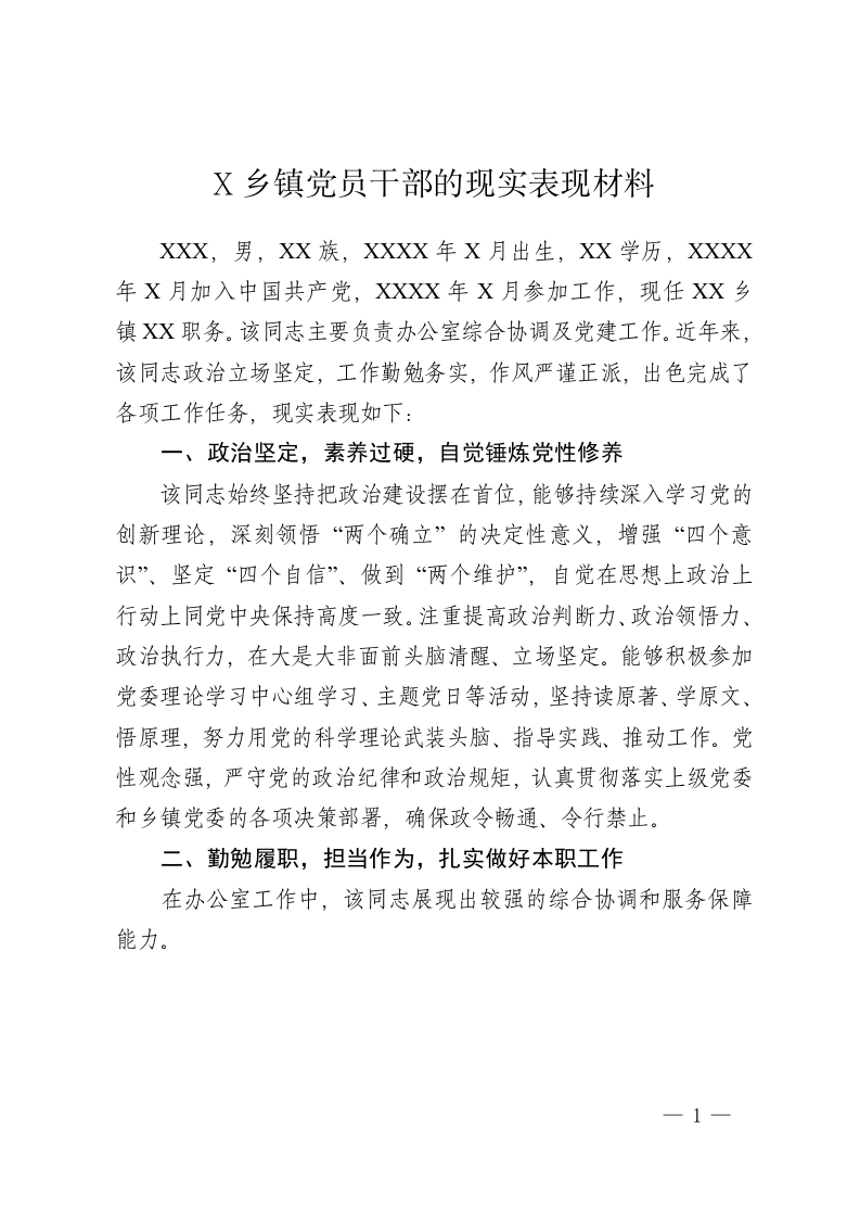X 乡镇党员干部的现实表现材料