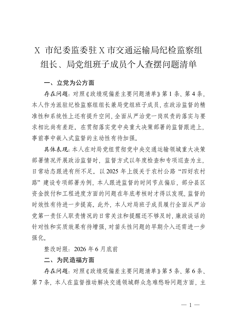 X 市纪委监委驻X市交通运输局纪检监察组组长、局党组班子成员个人查摆问题清单