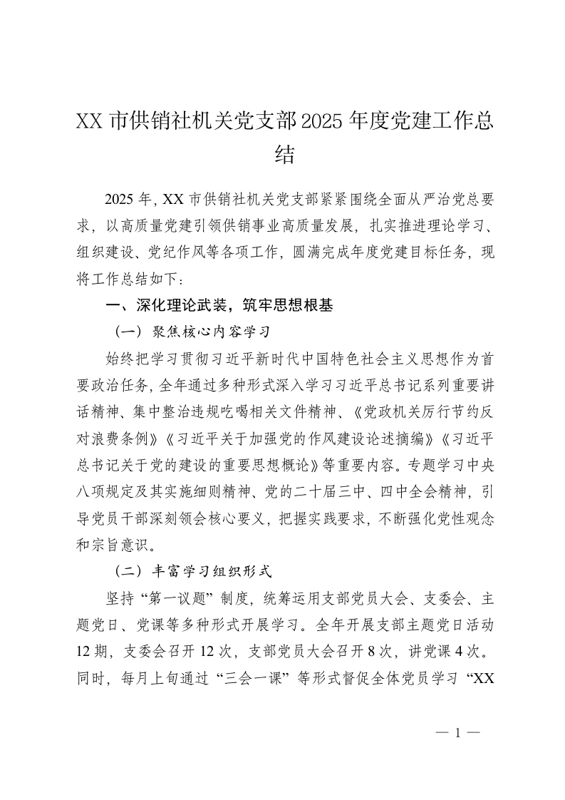 XX 市供销社机关党支部2025 年度党建工作总结