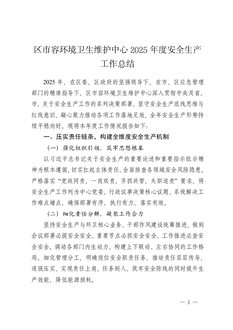 区市容环境卫生维护中心 2025年度安全生产工作总结