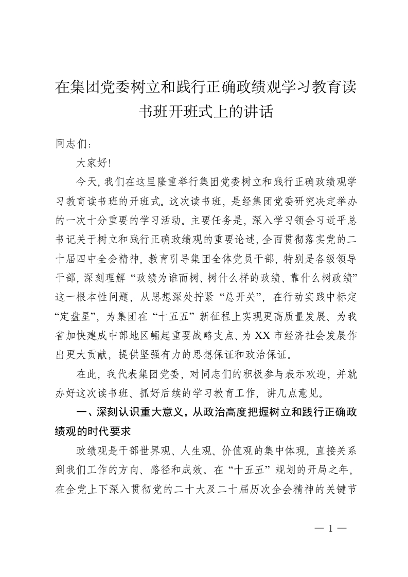 在集团党委树立和践行正确政绩观学习教育读书班开班式上的讲话