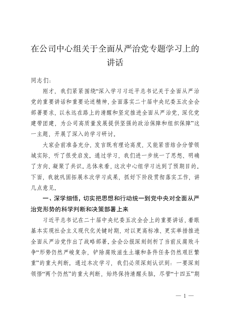 在公司中心组关于全面从严治党专题学习上的讲话