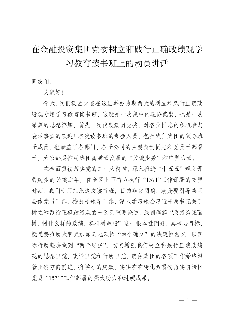 在金融投资集团党委树立和践行正确政绩观学习教育读书班上的动员讲话