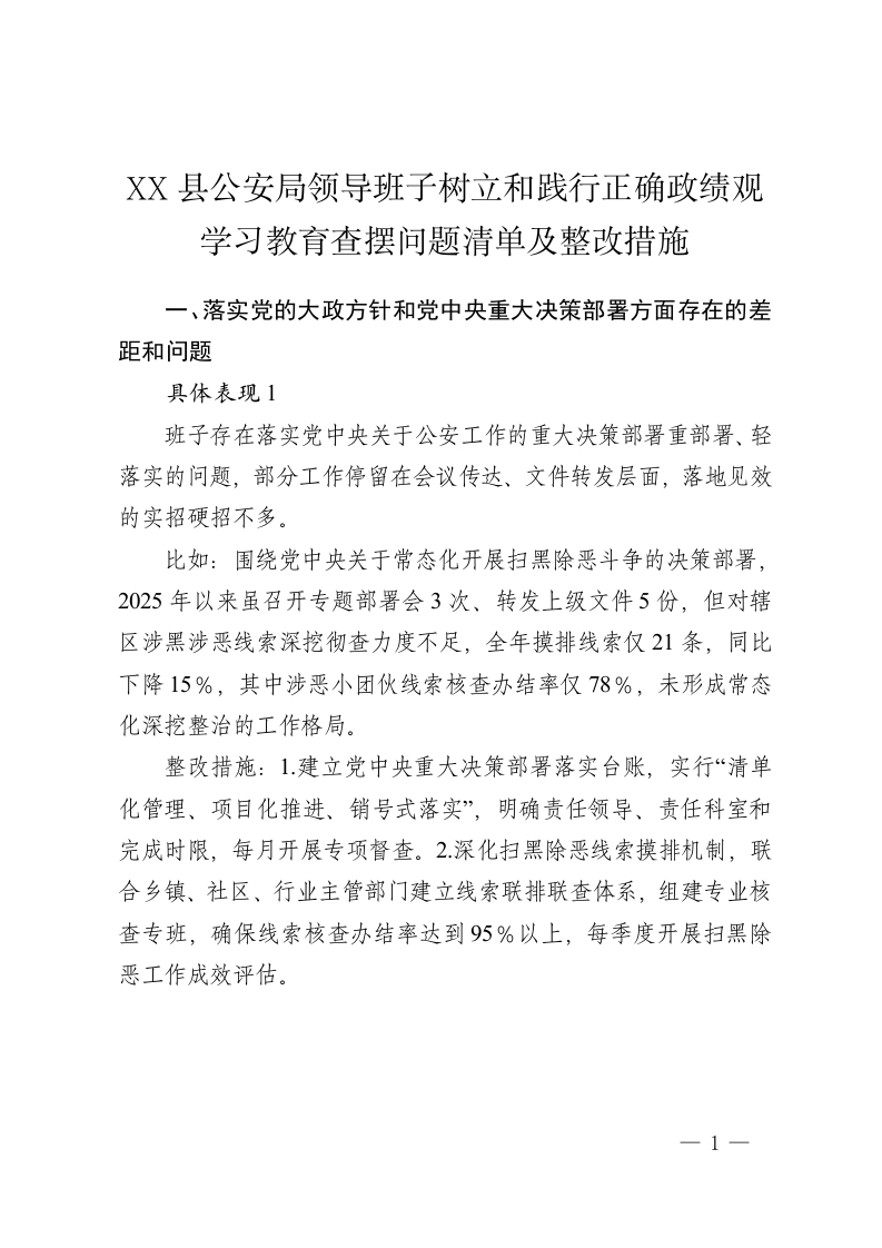 XX县公安局领导班子树立和践行正确政绩观学习教育查摆问题清单及整改措施