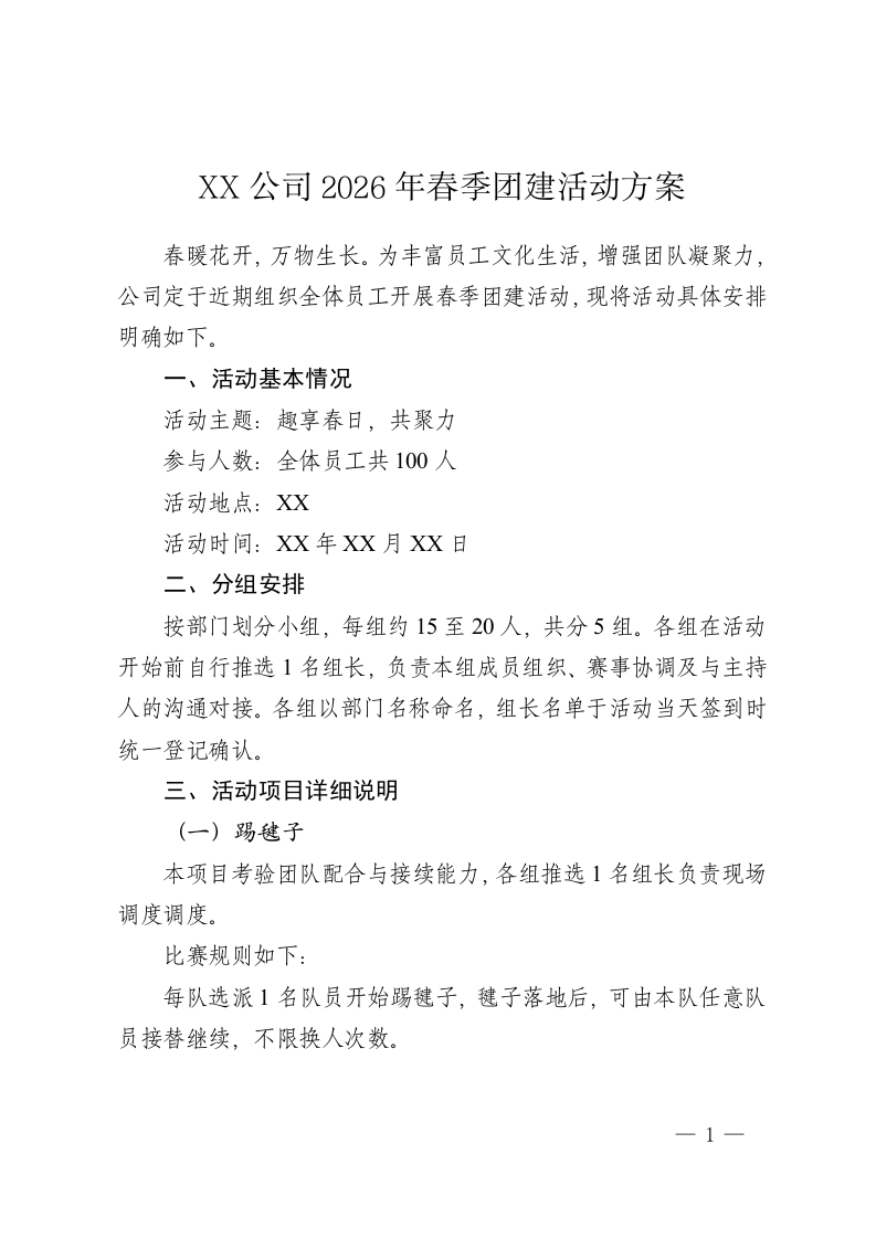 首页公文大全计划方案XX 公司2026 年春季团建活动方案