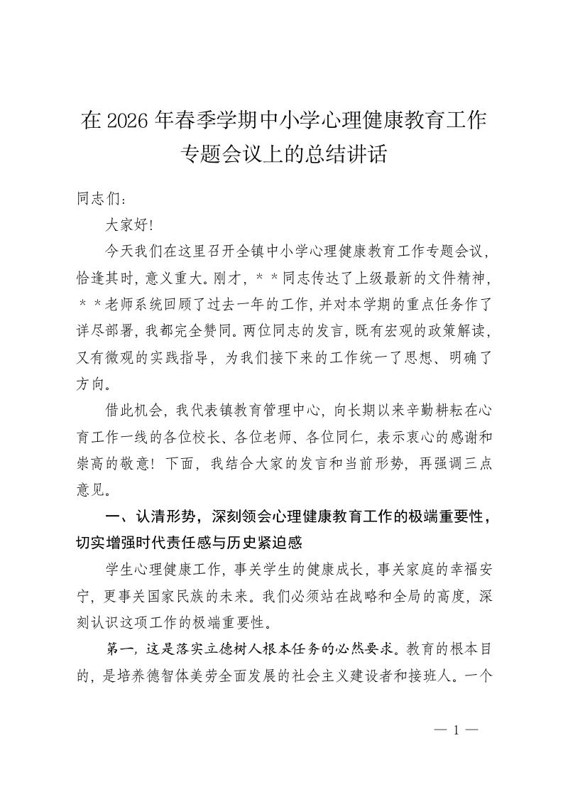 首页公文大全讲话发言在2026年春季学期中小学心理健康教育工作专题会议上的总结讲话