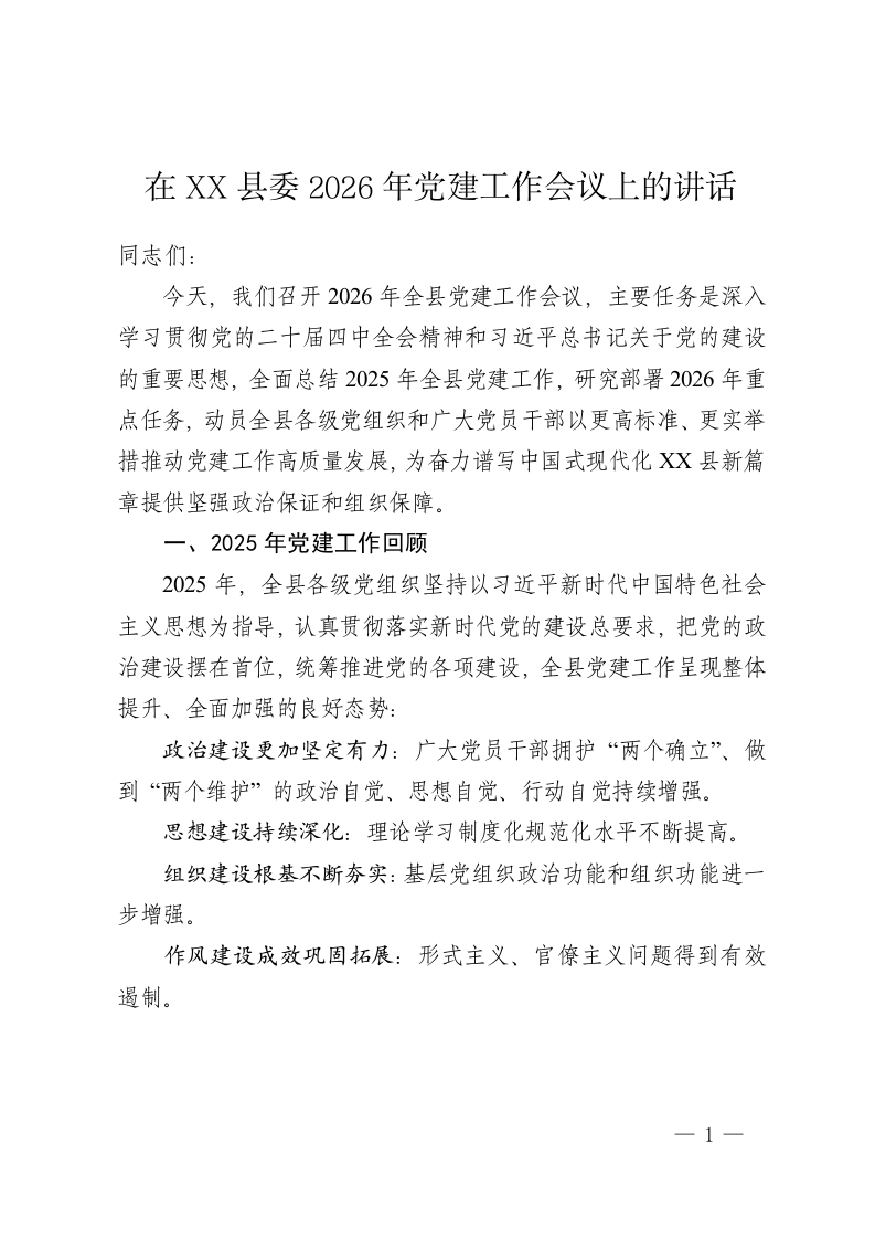 在 XX 县委2026 年党建工作会议上的讲话