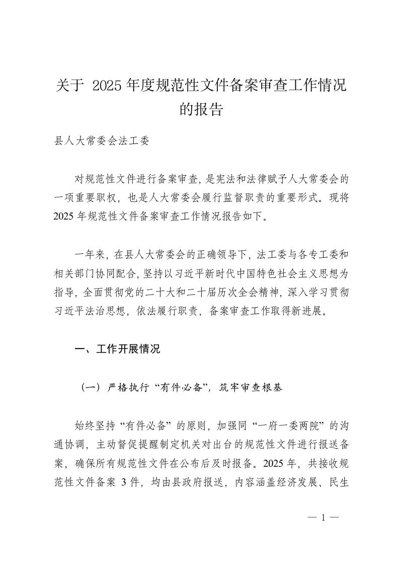 关于 2025年度规范性文件备案审查工作情况的报告